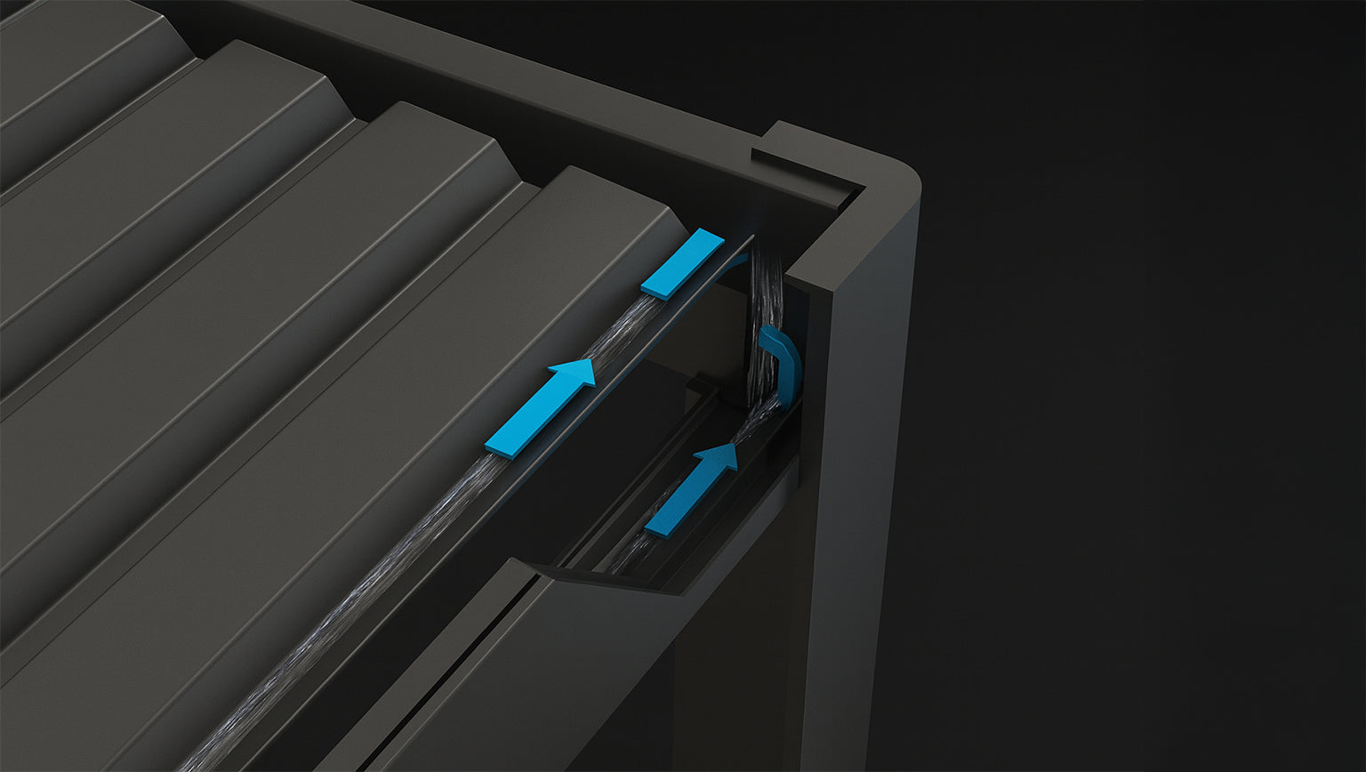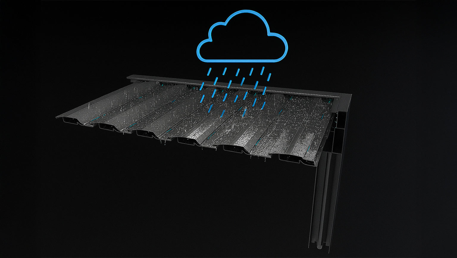 Once closed, the slats function as integrated drainage channels, directing water toward the surrounding beams. From there, an internal gutter system guides the water into the supporting posts, where it is efficiently drained away—keeping your space dry and comfortable, even during heavy rainfall.