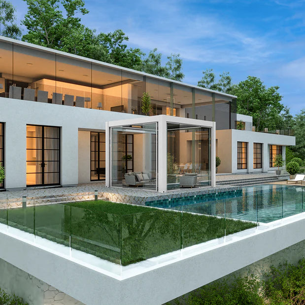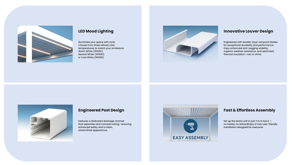 Postower pergolas and horizontal louvered roofs are crafted entirely from high-quality aluminum, offering a modern design that allows natural light and airflow when open. Powered by an advanced electric telescopic motor system, the slats are engineered with precision-fit aluminum profiles to ensure a tight seal when closed—completely blocking out rain.