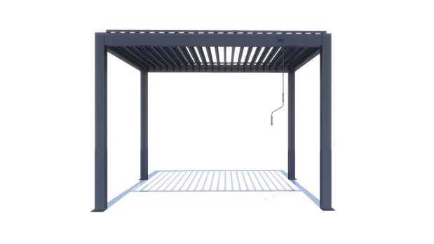 As part of the bioclimatic pergola collection, the APP pergola offers intuitive control over airflow and natural light. Designed with simplicity in mind, its manually operated blades—capable of rotating up to 120°—require no electricity, making it a truly minimalist solution. The absence of a motor not only reduces complexity but enhances its clean, understated design. The flat aluminum louvers contribute to its modern aesthetic, remaining only subtly visible even when fully open.