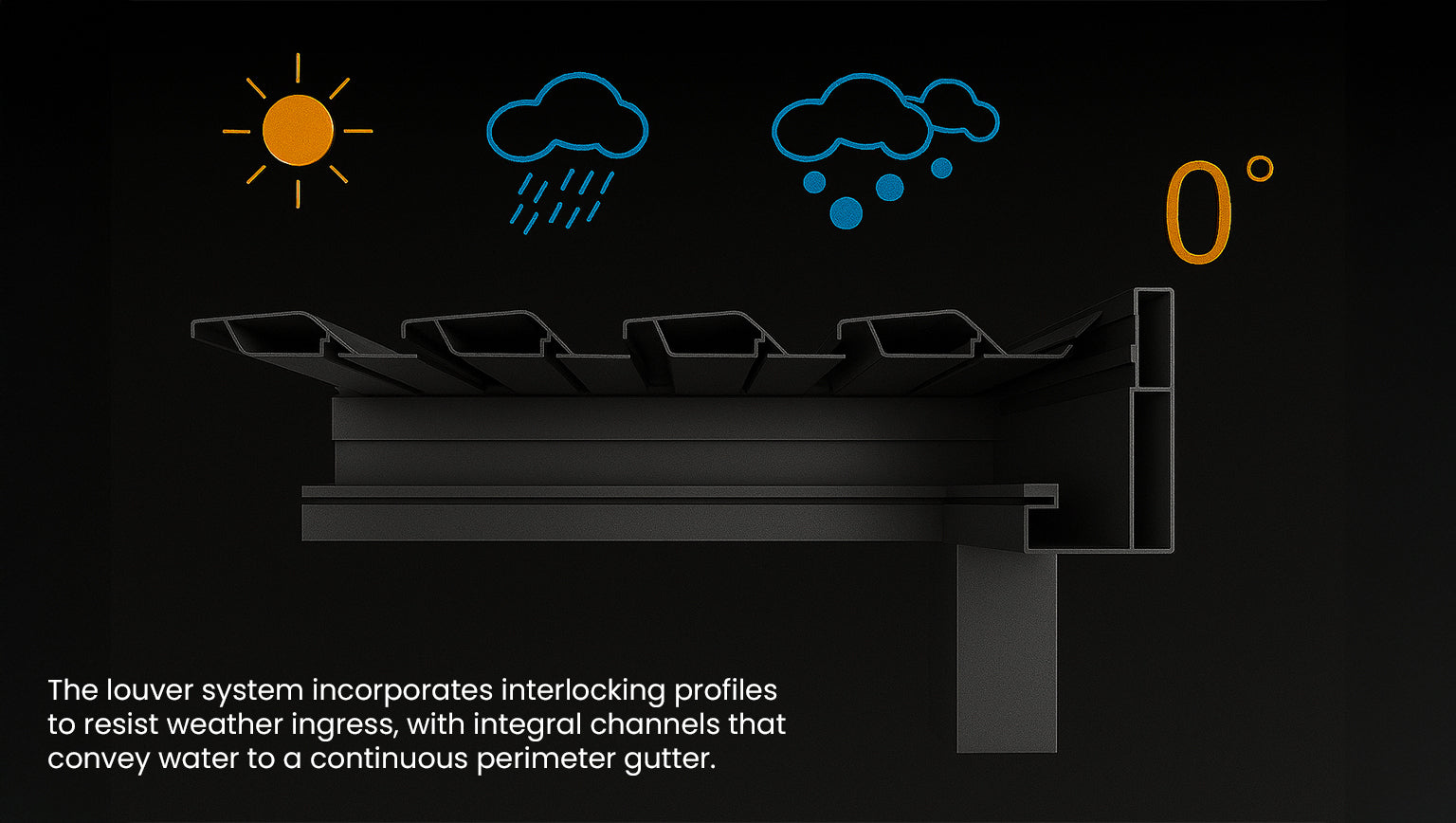 Once closed, the slats function as integrated drainage channels, directing water toward the surrounding beams. From there, an internal gutter system guides the water into the supporting posts, where it is efficiently drained away—keeping your space dry and comfortable, even during heavy rainfall.