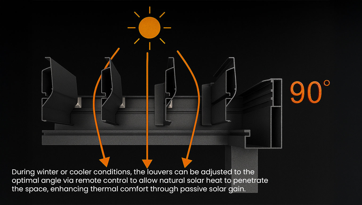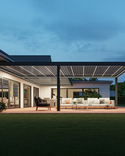 On warm summer days, partially closing and tilting the blades upward reflects sunlight away while still allowing gentle air circulation, casting dappled shade and keeping the space comfortably cool. Open the louvers up to a full 150° and the roof transforms, inviting in sunlight and creating a seamless transition between indoors and out. APP blurs the lines between exterior and interior—where comfort meets clarity, and daylight flows effortlessly into evening.