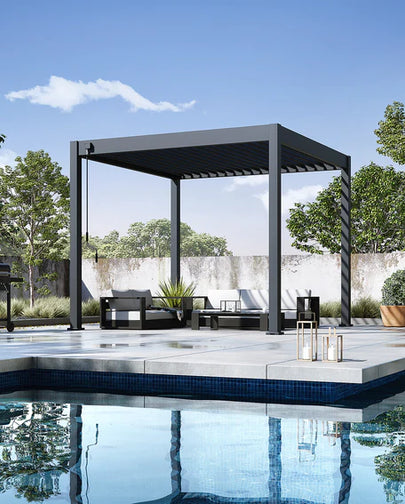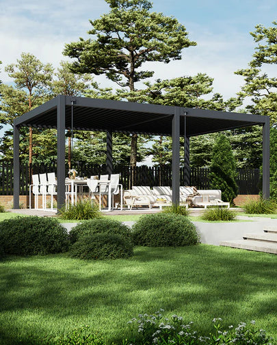 Our aluminum pergolas combine modern design with practical function—offering sleek, contemporary aesthetics that elevate any outdoor space. With clean lines and a stylish finish, they deliver a sophisticated look while still providing generous shade and comfort.